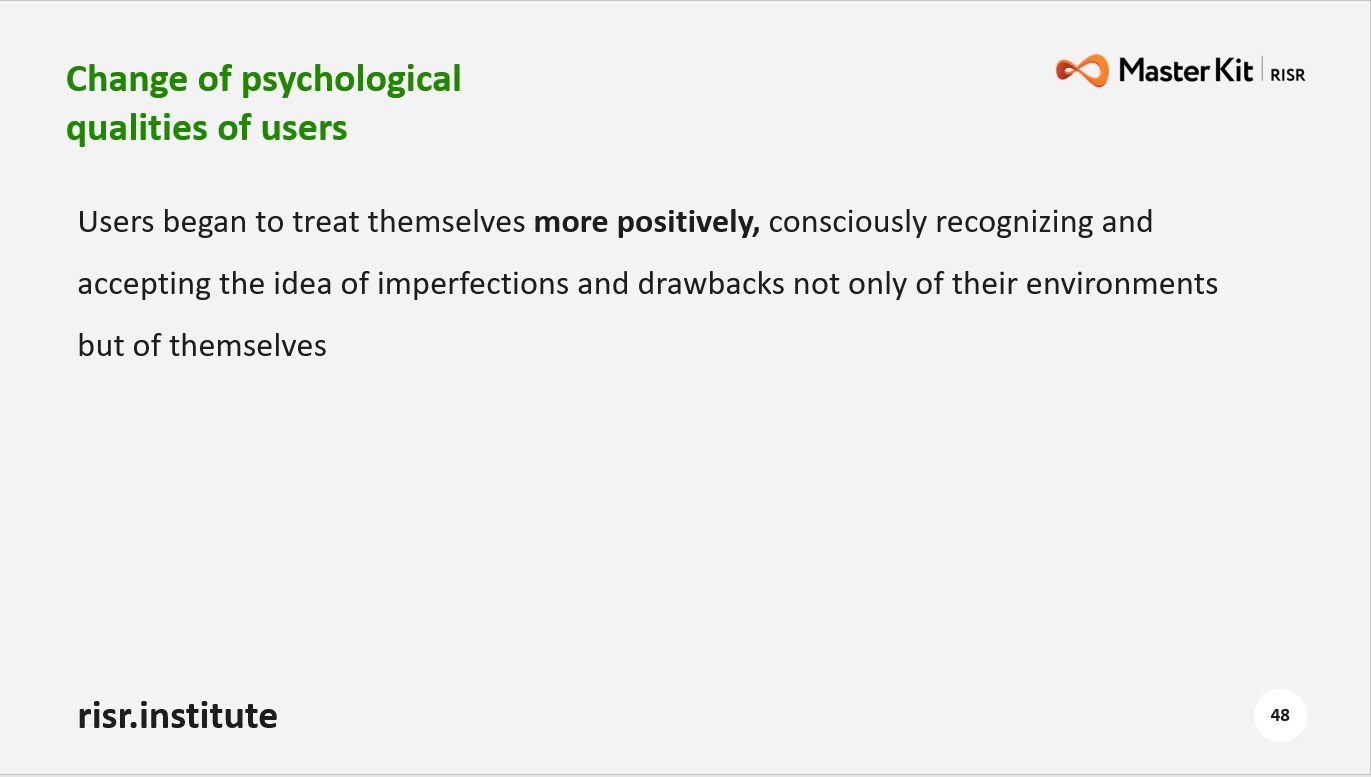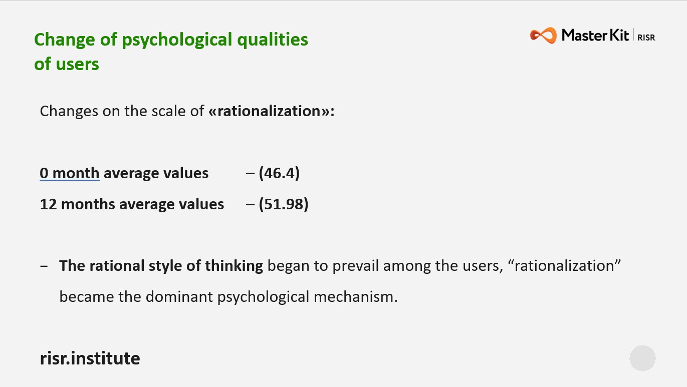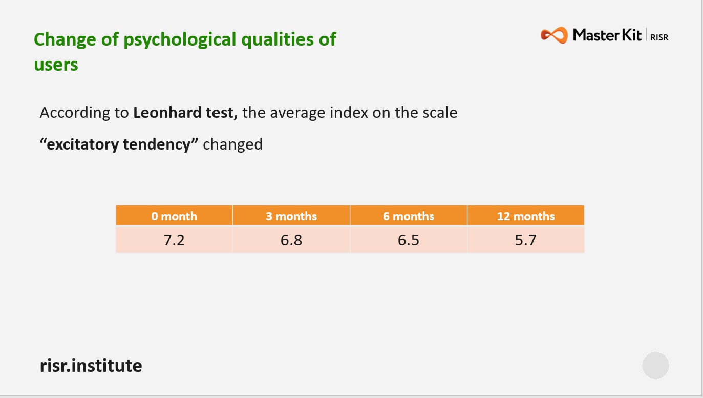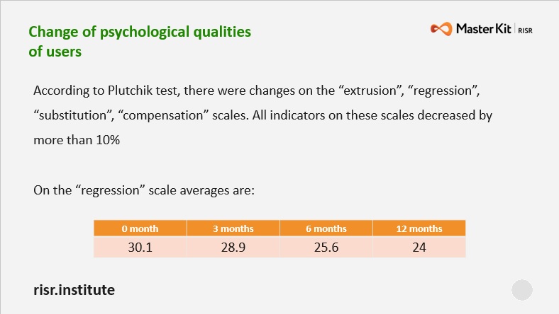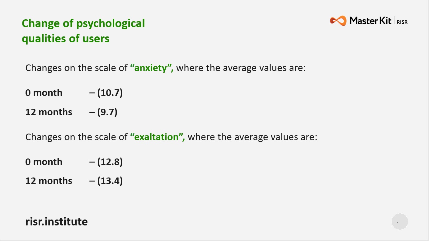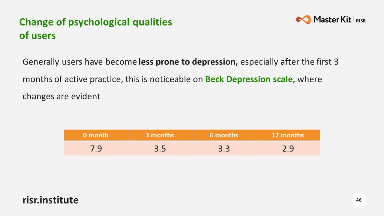 There is plenty of research that shows that internet delivered non guided CBT works and can be just as effective as therapist delivered treatment for anxiety and depression. Master Kit is a combination of self-directed CBT and video coaching. Additionally, there is ongoing research collaboration with Moscow State University and Eotvos Lorand University in Budapest and the latest results of a study of over 4000 users of Master Kit were presented at EBM conference in Oxford in July 2019. Here are some of the results presented.